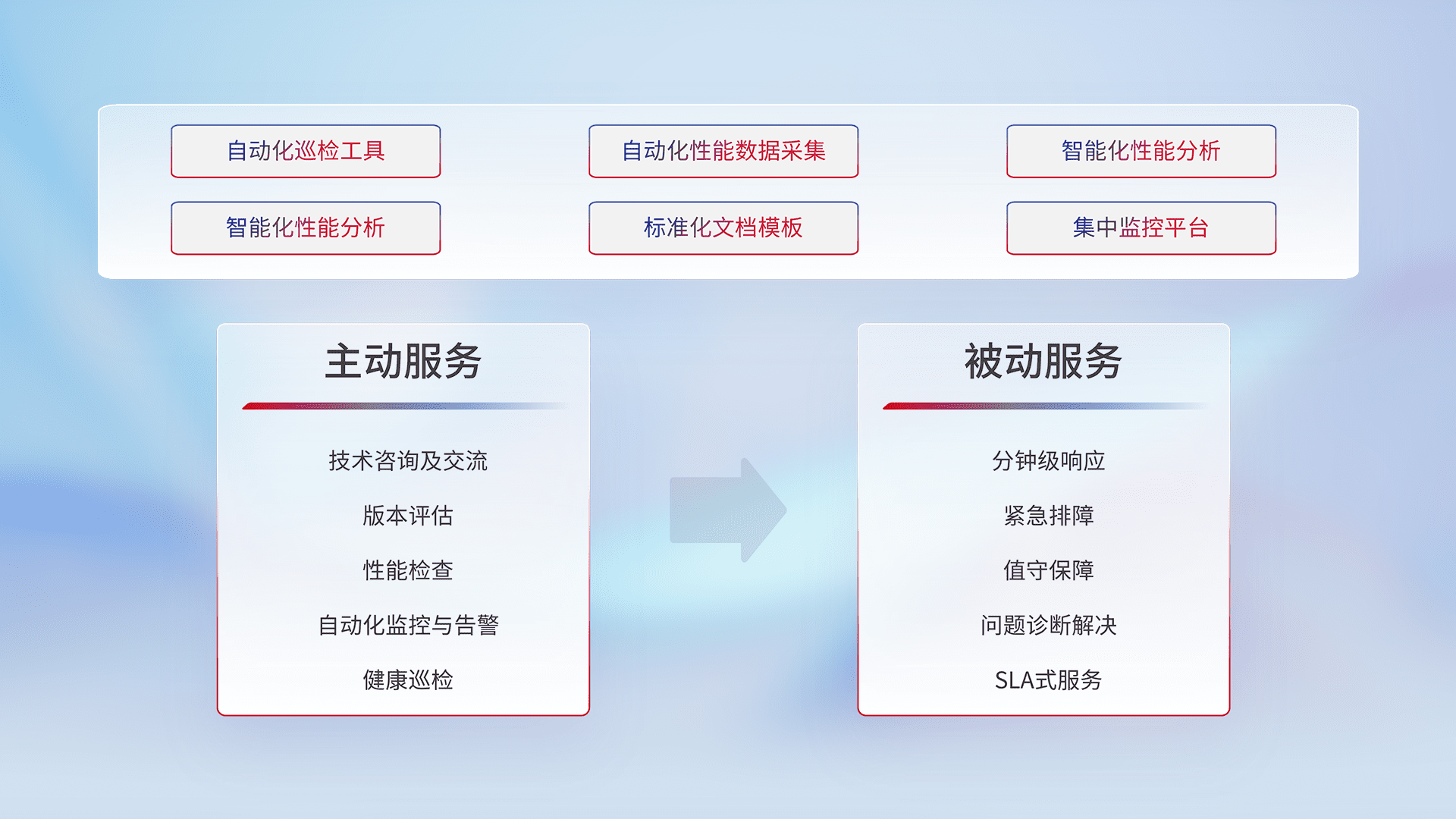 智能化工具和标准化文档,,,保障服务质量,,,提供主动服务(包含技术咨询、、、、版本评估、、、、性能检查、、、自动化监控与告警、、健康巡检)和被动服务包含(分钟级响应、、、紧急排障、、、值守保障、、问题诊断解决、、、、SLA服务)。。