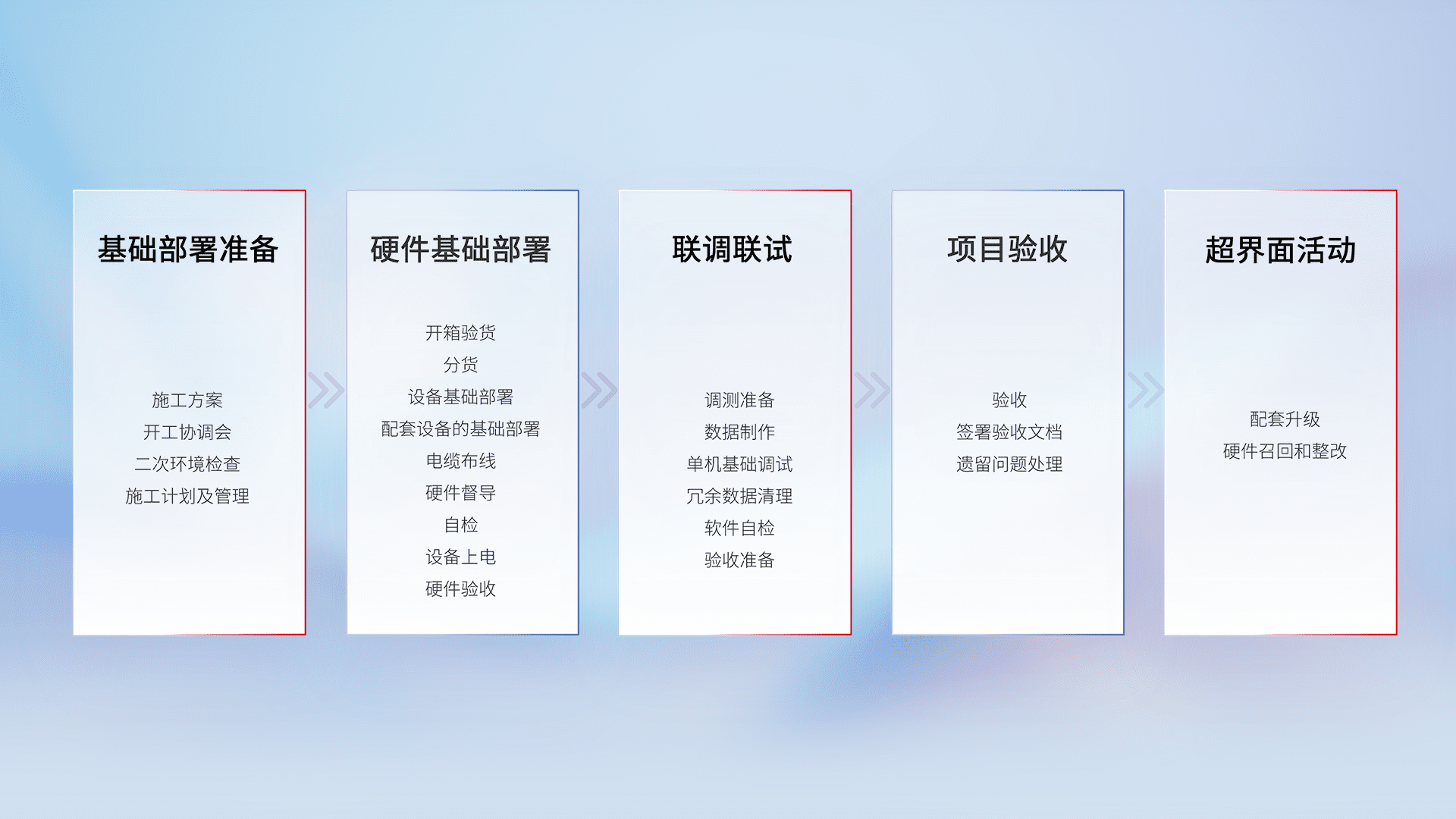 从基础部署准备、、、硬件基础部署、、、、联调联试、、项目验收、、、越界面活动的全过程可追溯,,保证施工质量和进度。。